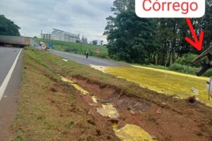 Carreta carregada de Óleo Vegetal tombou despejando toda a carga