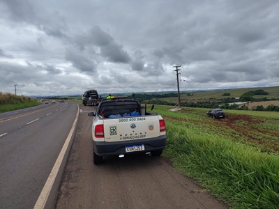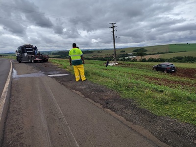 Por volta das 13:00 hs. Enfre o Posto Gisele um Fiat Argo aquaplanou estava indo sentido Londrina onde mora o Condutor o veículo saiu da pista para a direita indo para na curva de nível na plantação de soja Siate e ABTR estiveram no local mais o motorista já estava fora do carro e muito bem não precisou de atendimento , tirando o susto apenas danos materiais de pequena monta , o DER esteve dando apoio aos amigos do guincho igapó