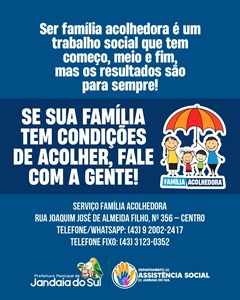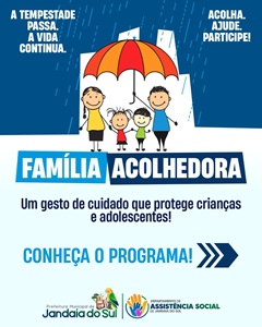 A Prefeitura de Jandaia do Sul, por meio do Departamento de Assistência Social, convida a população a conhecer e participar do programa Família Acolhedora, uma iniciativa que oferece proteção, cuidado e apoio a crianças e adolescentes que, por diferentes motivos, precisam se afastar temporariamente de suas famílias de origem.