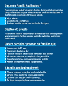 Mais do que um ato de solidariedade, acolher é um compromisso com o futuro. O programa busca famílias dispostas a oferecer um ambiente seguro, afetuoso e estruturado, garantindo que essas crianças e adolescentes tenham seus direitos preservados enquanto suas situações são acompanhadas pela rede de proteção.