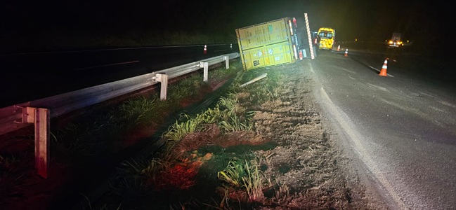 O Veículo atrelado ao semirreboque seguia sentido Norte, quando, no Km 439, veio a tombar sobre o guard rail metálico e canteiro central da rodovia. Seu condutor veio a óbito no local. Não houve interdição da via e o fluxo segue normal no local. Equipes PRF, Concessionária da rodovia, Polícia Civil, Perícia e IML estiveram no local para atender a ocorrência.