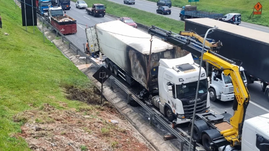 Uma carreta carregada com frios e laticínios pegou fogo na madrugada desta sexta-feira (20), na BR-116, no bairro Umbará, em Curitiba, e foi alvo de furto de carga enquanto ficou parada no acostamento da via. O incêndio aconteceu entre o viaduto da Linha Verde e a Rua Nicolla Pelanda, na pista sentido São Paulo. O veículo transportava carga de presunto, queijo e outros produtos refrigerados quando as chamas começaram. Mesmo após o controle inicial da situação, a carreta continuou soltando fumaça até o fim da manhã de sexta-feira. Durante a ocorrência, um vídeo registrou o momento em que pessoas tentaram saquear a carga. Nas imagens, é possível observar a população pegando itens do caminhão e levando para outro veículo. Já pela manhã, houve nova tentativa de subtrair os produtos. A concessionária responsável pelo trecho retornou ao local para realizar o controle total do incêndio e garantir a segurança na área.