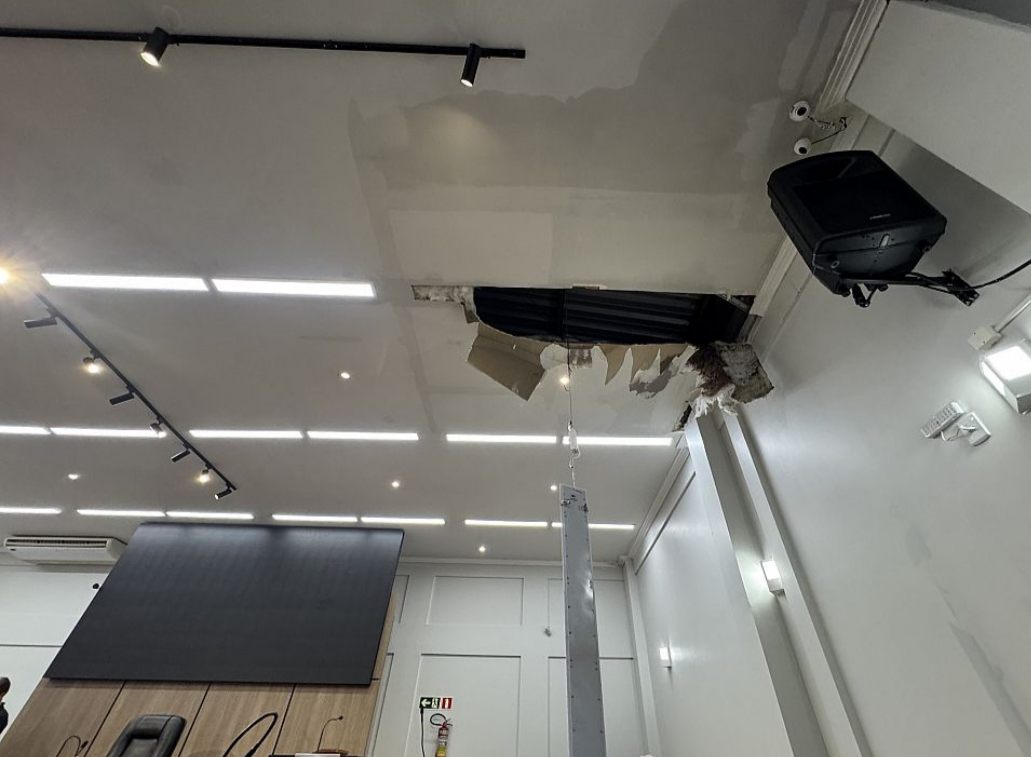 A chuva causou danos no teto e na parte interna do plenário, inclusive nos móveis, cadeiras e microfones. O forro cedeu, parte da iluminação caiu, o piso ficou encharcado, inclusive no local onde ocorrem as votações, o que representa riscos para as pessoas que circulam pelo local.