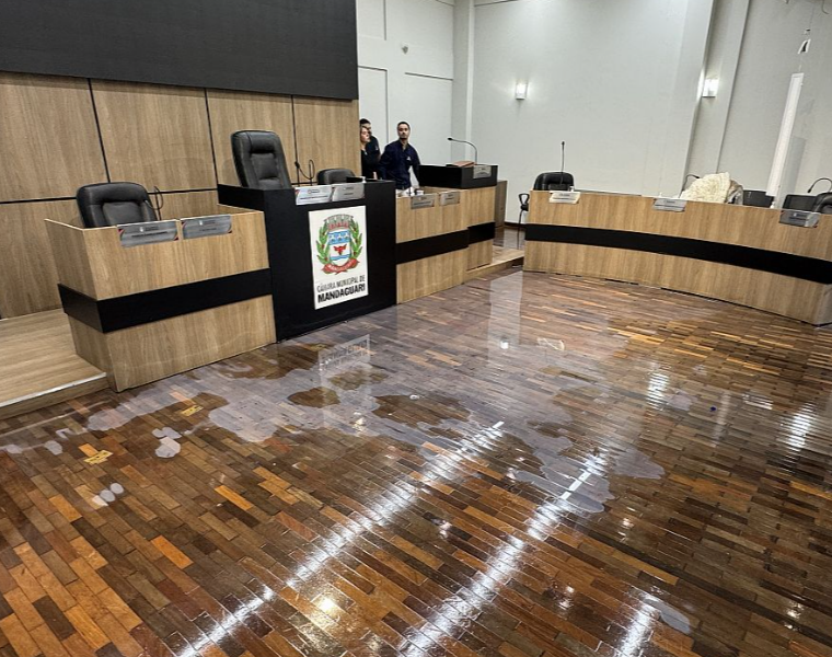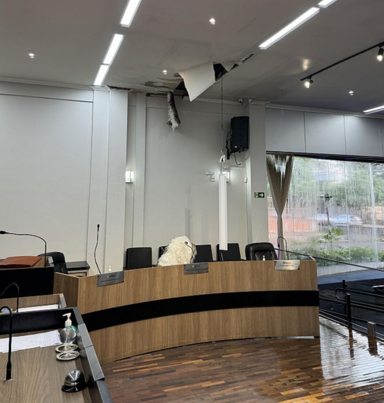 A chuva causou danos no teto e na parte interna do plenário, inclusive nos móveis, cadeiras e microfones. O forro cedeu, parte da iluminação caiu, o piso ficou encharcado, inclusive no local onde ocorrem as votações, o que representa riscos para as pessoas que circulam pelo local.