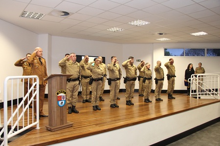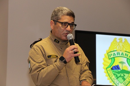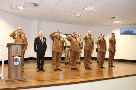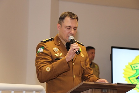 O Comandante do BPRv, Tenente-Coronel Gustavo Dalledone Zancan, recepcionou os convidados e agraciados no auditório do Batalhão de Polícia Escolar Comunitária (BPEC) na tarde desta terça-feira (28).