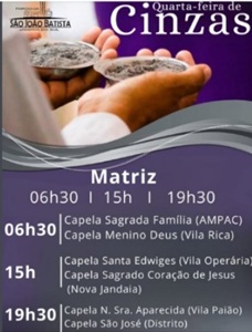 40 dias de preparação e reflexão para a Páscoa, simbolizando o fim do Carnaval e um chamado à conversão e penitência, lembrando a fragilidade da vida (“és pó e ao pó voltarás”). Neste dia, padres impõem cinzas (de ramos do Domingo de Ramos anterior) na testa dos fiéis em forma de cruz, acompanhadas de frases bíblicas sobre arrependimento e humildade, convidando à oração, jejum e caridade.