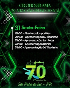 A cidade está em festa! São Pedro do Ivaí completa 70 anos de emancipação política no dia 30 de outubro, e a comemoração promete ser inesquecível. Venha celebrar essa história de conquistas, alegria e tradição com uma programação repleta de shows imperdíveis, atrações culturais e muita diversão para toda a família.