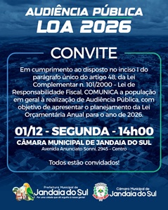 A Prefeitura de Jandaia do Sul informa que realizará, no dia 1º de dezembro, segunda-feira, às 14h, uma Audiência Pública para apresentação do planejamento da Lei Orçamentária Anual (LOA) 2026.