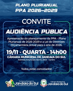 A Prefeitura de Jandaia do Sul promove, na quarta-feira (19), às 14h, uma audiência pública na Câmara Municipal para apresentar o Plano Plurianual (PPA) 2026–2029 e a Lei de Diretrizes Orçamentárias (LDO) de 2026.