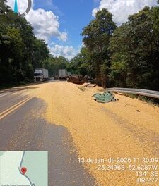 Na BR-277, km 496, foi registrado o tombamento de um caminhão que transportava carga de milho. O motorista, que ainda não teve sua identificação confirmada...