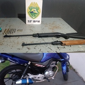 Em patrulhamento na data de hoje (07/02/26) por volta das 19h, equipe abordou uma motocicleta que estava com escape alterado, com dois indivíduos. Na revista pessoal a V. H. dos S. V. de 23 anos foi localizado no bolso da bermuda, 8 munições de calibre .22. Perguntado ao outro abordado A. F. de A. J. de 24 anos, assumiu a propriedade das munições que estavam com seu amigo e disse ter duas armas (espingardas) em sua residência. Na revista domiciliar foram localizadas duas armas de fogo (espingarda), sendo uma de chumbinho e outra torneada para o calibre .22, além de, mais 19 munições .22 e 8 munições .9mm.