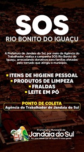 A Prefeitura de Jandaia do Sul, por meio da Agência do Trabalhador, realiza a campanha SOS Rio Bonito do Iguaçu, arrecadando donativos para famílias afetadas pelo tornado que atingiu o município.