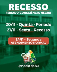 A Prefeitura de Jandaia do Sul comunica que não haverá expediente nos dias 20 e 21 de novembro, em razão do feriado da Consciência Negra e do ponto facultativo previsto no Decreto nº 10.432/2025.