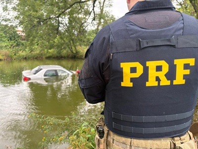 Ao fugir da PRF, o motorista entrou em uma propriedade rural às margens da BR-163 e parou apenas quando o carro afundou nas águas; eles foram apreendidos.