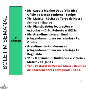 Aqui está a Programação para Sábado e Domingo na Paróquia São João Batista