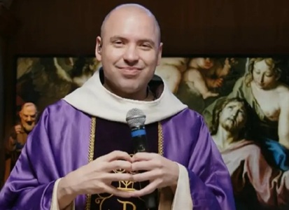 No vídeo, frei Gilson discursa para fiéis e cita um trecho bíblico de Gênesis 2:18 ao abordar a relação entre homens e mulheres.