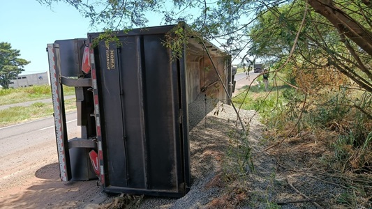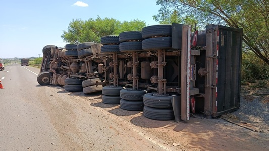 Caminhão perdeu o controle da direção e tombou em reta, em local de pista dupla.