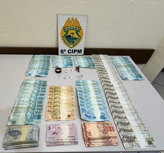 Equipe policial em posse de informações de que um referido bar na região central estava comercializando e sendo ponto de uso de entorpecentes, realizou diligências afim de verificar tal situação, quando em dado momento um gol na cor cinza estacionou na frente do comércio descendo um masculino que adentrou o recinto e logo em seguida retirou-se. Sendo assim, por fundada suspeita, de que poderia ter adquirido ilícitos a guarnição procedeu abordagem localizando no bolso esquerdo um invólucro de substância análoga a cocaína e ao ser indagado a respeito da procedência do mesmo relatou ter pego em frente ao bar anteriormente citado. Desta feita, equipe de município juntamente com apoio de duas outras guarnições realizou abordagem no estabelecimento comercial e residência do proprietário, onde fora localizado 2,3 g de substância análoga a cocaína, bem como o valor de R$ 10.505,00 em notas variadas. Por tanto fora dado voz de prisão ao masculino proprietário do bar, pelo crime de tráfico de drogas e encaminhamento do outro masculino por drogas para consumo.