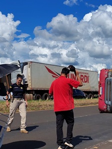 Uma carreta Bitrem carregada de milho seguia sentido Maringá ao passar em frente ao Posto Carro de Boi já próximo a Marialva o motorista deparou com fila de veículos nas duas pistas subindo , ao tentar atravessar o canteiro pelas esquerda para não causar um acidente mais violento , tentando evitar bater em outros veículos a sua frente pulou o canteiro , o cavalo mecânico e a primeira carreta passou mais a segunda carreta ao pular o canteiro puxou a carga que estava a sua frente e acabou tombando na pista contraria que descia sentido Mandaguari , o transtorno é muito grande :