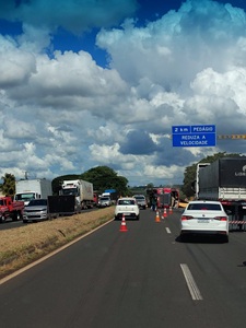 o porquê destas filas , no alto está sendo instalado uma estrutura que vai atravessar a pista e com isso está sendo usado apenas uma faixa das pista dupla foi ai que criou o trânsito muitíssimo lento e causou o acidente. a PRF está no local orientando os motorista que por ali passam