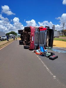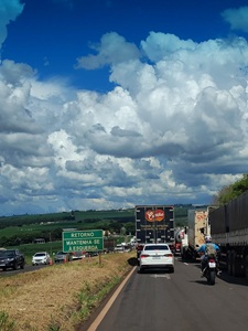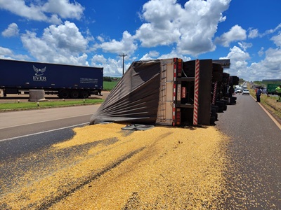 Uma carreta Bitrem carregada de milho seguia sentido Maringá ao passar em frente ao Posto Carro de Boi já próximo a Marialva o motorista deparou com fila de veículos nas duas pistas subindo , ao tentar atravessar o canteiro pelas esquerda para não causar um acidente mais violento , tentando evitar bater em outros veículos a sua frente pulou o canteiro , o cavalo mecânico e a primeira carreta passou mais a segunda carreta ao pular o canteiro puxou a carga que estava a sua frente e acabou tombando na pista contraria que descia sentido Mandaguari , o transtorno é muito grande :