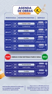 A partir das 10 horas, operação Pare e Siga no km 7+000 ao km 8+000 para implantação das defensas metálicas. Previsão de término às 18 horas.