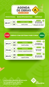 Ainda conforme planejamento, no domingo (09), ocorrerá a demolição controlada na Obra de Arte Especial (OAE) localizada no km 7+800 da PR-418, entre os bairros entre os bairros Santa Felicidade e Lamenha Pequena, em Curitiba. Para essa ação, o trânsito também ficará no sistema PARE E SIGA das 7h às 20 horas do domingo (09).
