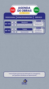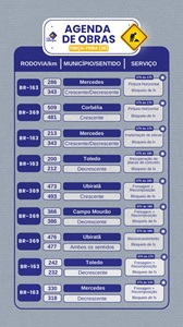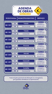 A Via Campo informa que será realizada operação de conservação viária na rotatória de acesso ao município de Guaíra/PR, no entroncamento das rodovias BR-163 e BR-272.